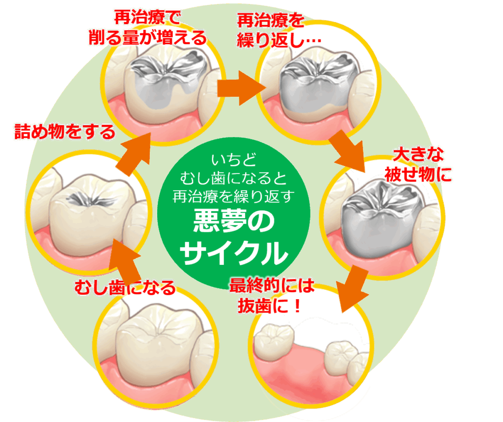 歯の治療は何度何度もやりかえができるわけではありません。まずはむし歯を発生させないこと、できてしまった場合再発をさせないということが重要になります。一般的には平均して同一の歯に対しての6回の治療を施した場合抜歯に至るケースが多いと言われています。